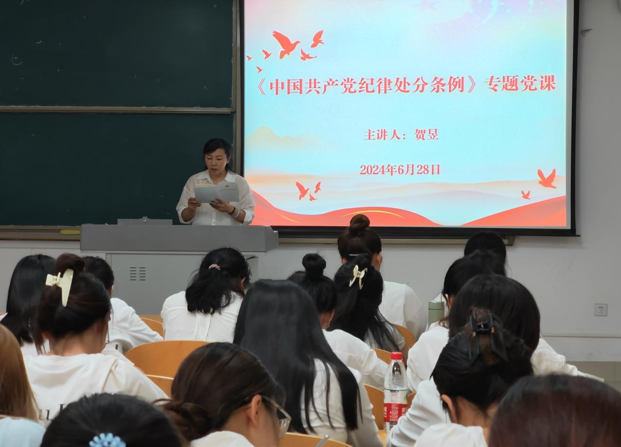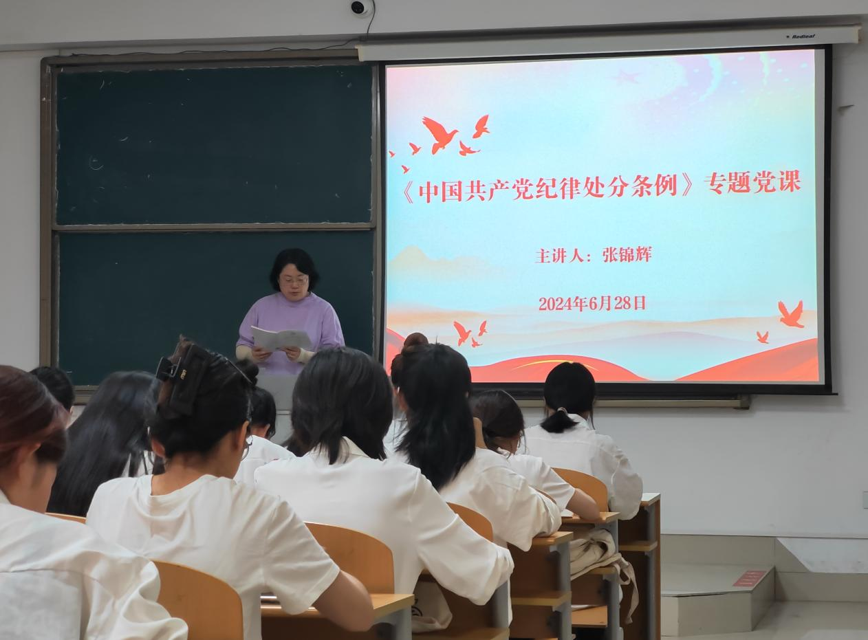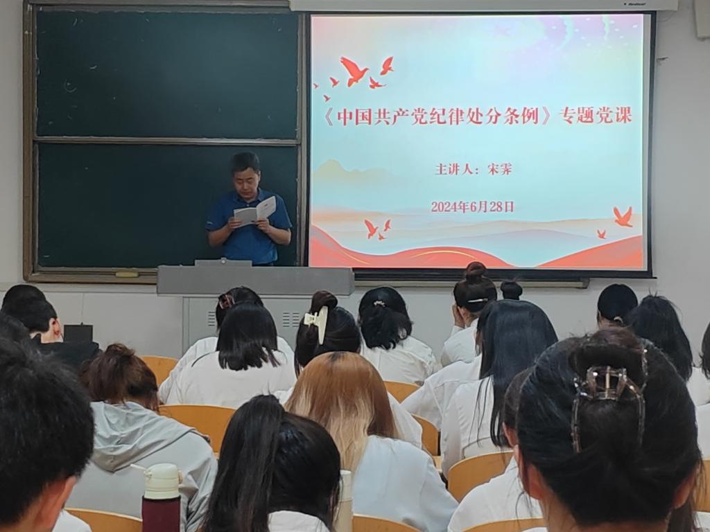 张锦辉院长、贺昱副书记和宋霁副院长分别围绕《中国共产党纪律处分条例》新修订内容及其重要特征进行了深入细致的讲解,告诫党员把政治纪律放在首要位置,并深刻剖析了违纪典型案例,引导党员真正做到学纪、知纪、明纪、守纪,将遵规守纪内化于心,外化于行。班子成员要求学生党员们要在学纪中锤炼党性,始终做到心中有党、心中有民、心中有责、心中有戒。在党课中,各位主讲人寄语全体学生党员,要坚定初心,始终在思想上、政治上、行动上同党中央保持高度一致,筑牢信念之基,在工作实践中经受考验和锻炼。学生党员们纷纷表示要以党纪为镜,以更高的标准要求自己,增强责任意识,努力做一名有理想、敢担当、能吃苦、肯奋斗的新时代优秀党员。
