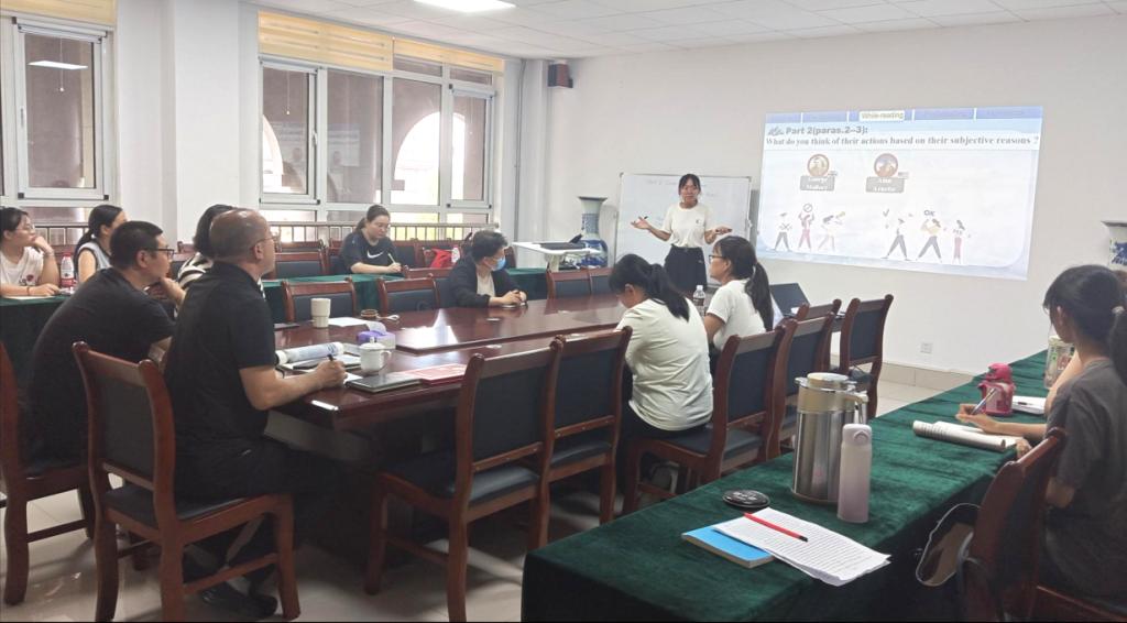 高中组两位参赛同学根据技能大赛固定题目展开模拟授课。石老师主要围绕教学活动设计的合理性、主题探讨的深入度、板书设计的科学性、语言表达与发音的准确性等方面对参赛选手的授课情况进行逐一点评与指导,为参赛同学提供了宝贵的建议。