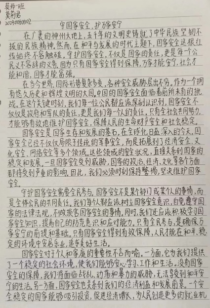 同学们结合自身的学习体会和深刻感悟,紧密围绕“守国家安全,护万家安宁”的核心主题,积极主动地搜集各类相关资料,以记叙或议论的形式,全方位、多角度地探讨了对国家安全的理解,并表达了维护国家安全的坚定信念,以真挚的情感歌颂了青春的美好,展现了他们对于“守国家安全,护万家安宁”的执着追求与坚定信念。