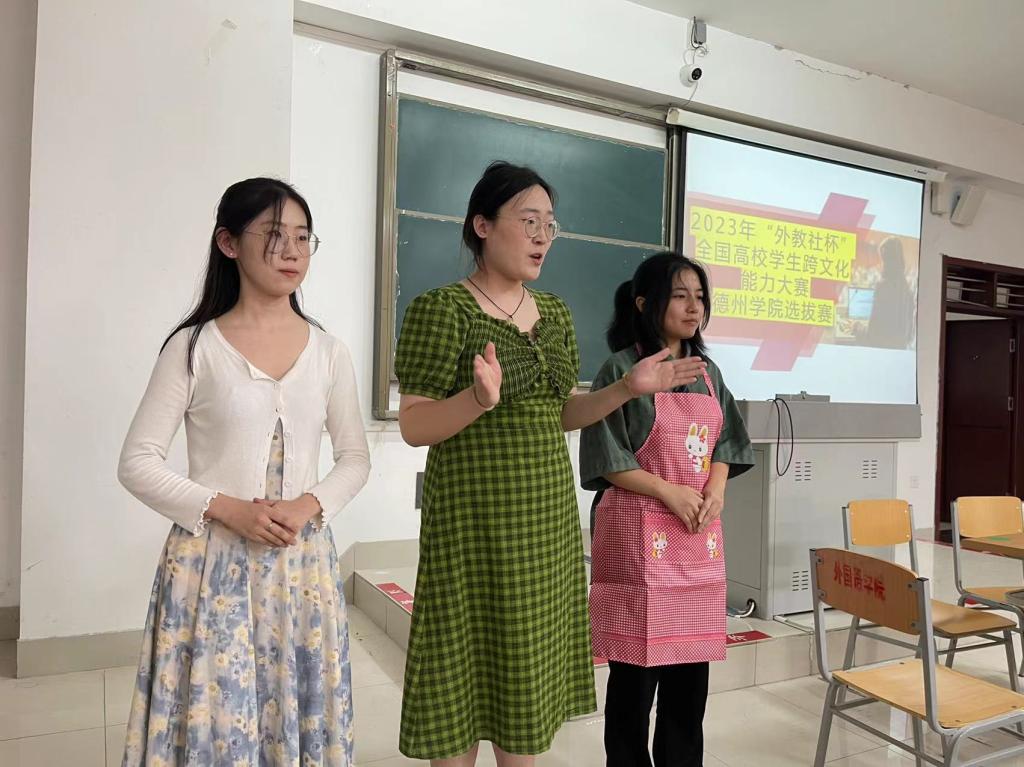 9月5日下午,2023年“外教社杯”全国高校学生跨文化能力大赛德州学院选拔赛在博文楼227教室举行。来自精品国产一区二区、经济管理学院、数学与大数据学院等的8个团队24名学生参加了比赛。比赛形式是3人团队赛,每组8-10分钟案例展示,并运用跨文化交际相关概念和理论对案例中的跨文化现象和交际策略等进行案例分析。经过选手激烈角逐和评委公正评审,来自精品国产一区二区的孙梦瑶、数学与大数据学院的李芳菲、纺织服装学院的王蕊鑫团队脱颖而出,代表我校参加山东省赛区比赛。