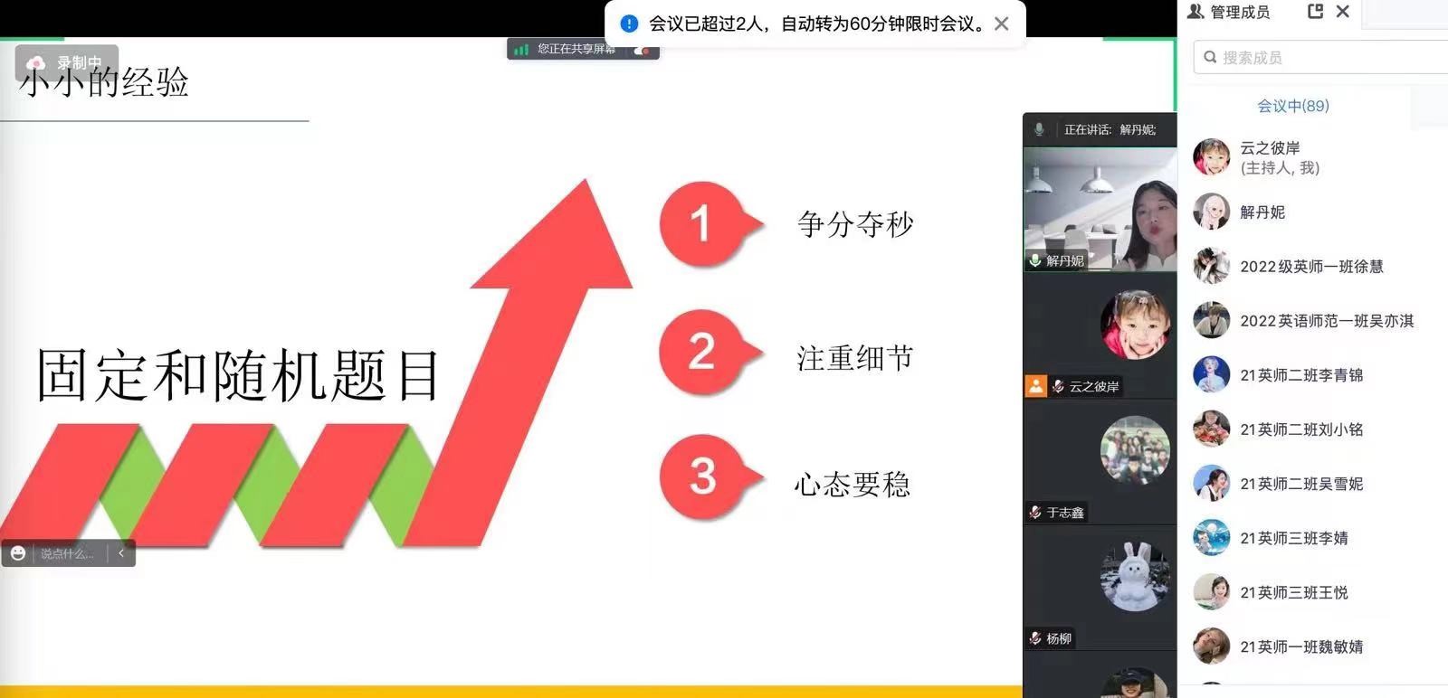 精品国产一区二区教师团队、省级决赛小学组一等奖获得者解丹妮、初中组二等奖获得者杨柳同学与高中组二等奖获得者于志鑫同学及2021级与2022级英语师范专业学生参加了本次交流会。交流会上,三位获奖同学从自己的比赛经历出发,分别就对师范生从业技能大赛的认识及比赛内容、备赛过程、获奖感受、经验教训等方面进行了经验分享,与参会同学交流了多项心得,为英语专业师范生提供了宝贵的经验和建议。