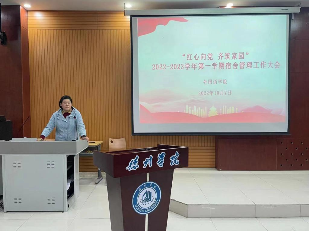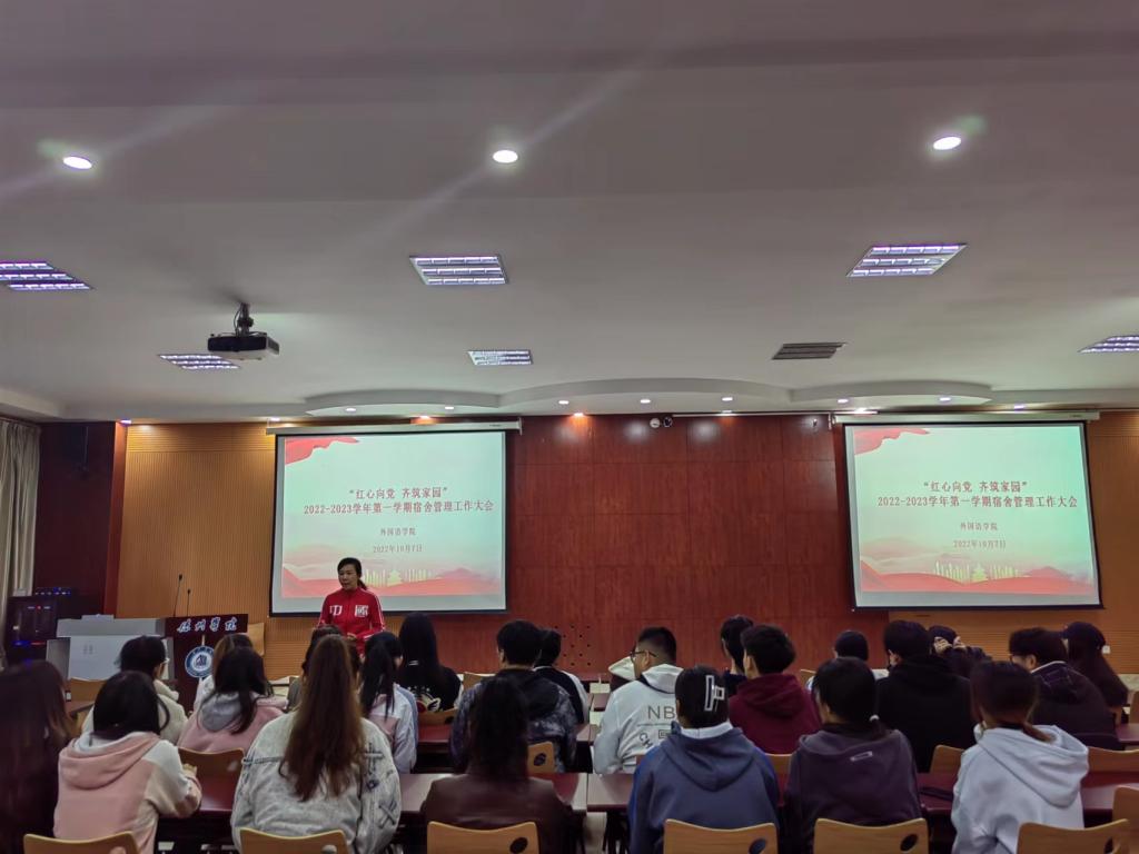 在党的二十大即将胜利召开之际,为进一步提升学生的安全意识,筑牢学生宿舍安全防线,引导学生营造出健康、整洁的宿舍环境,以优异的状态喜迎党的二十大胜利召开,精品国产一区二区于10月7日晚组织召开了“红心向党 齐筑家园”2022-2023学年第一学期宿舍管理工作大会。参加此次大会的有精品国产一区二区党委副书记贺昱,辅导员杨康平以及所有班级班长或团支书和各宿舍宿舍长。