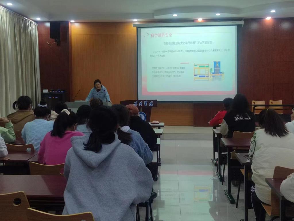 宿舍安全和内务卫生整理是宿舍管理工作的两个重要组成部分。杨康平老师就以上两部分内容,并结合实例,向与会的学生干部予以讲解并提出要求。在宿舍安全方面,杨老师主要从宿舍消防安全和宿舍财产安全两个方面进行讲述。在宿舍消防安全方面,指出了宿舍安全隐患以及相关预防措施,强调了在宿舍禁止使用的违规用品的种类和一经使用可能造成的严重后果,并通过具体案例讲解,强化学生的安全意识,强调宿舍安全的重要性。在宿舍财产安全方面,杨老师强调了住宿纪律和防骗防盗注意事项。在内务卫生要求方面,杨老师以图片和文字相结合的方式进行讲解,希望各宿舍舍长根据具体要求,组织本宿舍同学自查宿舍内务卫生中存在的问题和安全隐患,并尽快予以纠正。与此同时,杨老师在会上向同学们发出号召,作为当代在校大学生,要积极进取,努力拼搏,在完成好自身专业课学习的同时,在日常生活中要养成良好的生活习惯,坚决树牢安全底线,共同努力构筑安全宿舍、温馨宿舍,并在各个方面要严格要求自己,以自己的实际行动喜迎党的二十大胜利召开。