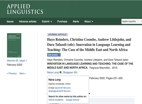 近日,精品国产一区二区龙娜娜博士在SSCI一区期刊Applied Linguistics发表文章“Innovation in Language Learning and Teaching”。该文2022年6月被Web of Science核心核集数据库收录。Applied Linguistics是全球语言学领域的权威期刊,由牛津大学出版社出版。2021年影响因子为4.155,5年影响因子6.178,在SSCI收录的192本语言学期刊中影响因子排名第一。