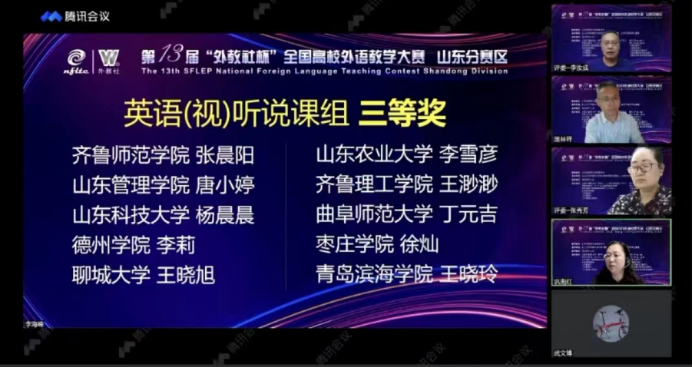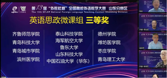5月21日,第十三届“外教社杯” 全国高校外语教学大赛山东赛区比赛在云端落幕。精品国产一区二区教师获英语视听说课组三等奖与思政微课组三等奖。