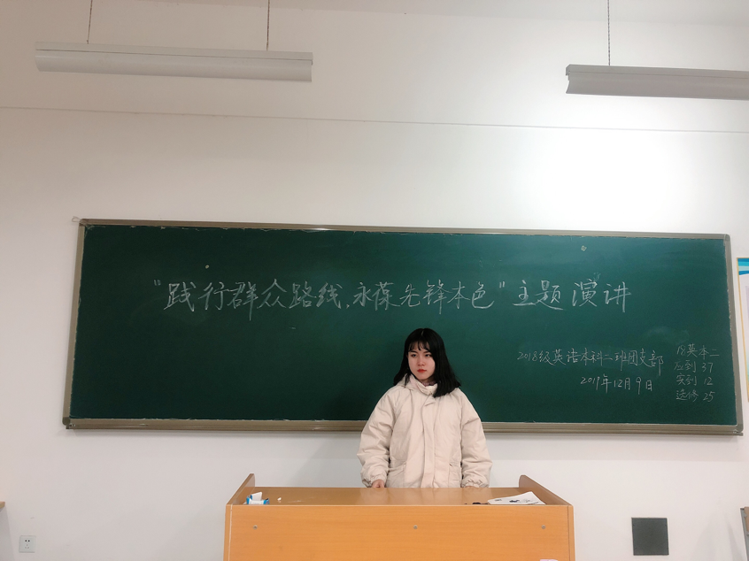2018级英语本科二班团支部在博文楼230举办了“践行群众路线,永葆先锋本色”主题演讲活动,在广大学生中掀起了学习党的十九大精神,践行“五个一”的热潮,为我院学子提供了精神力量。