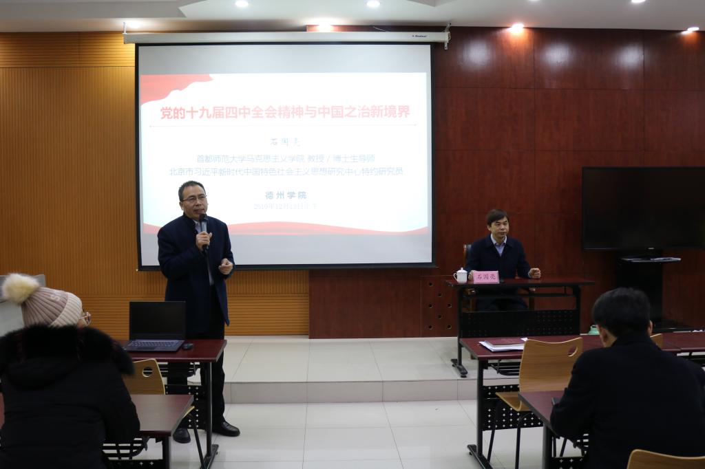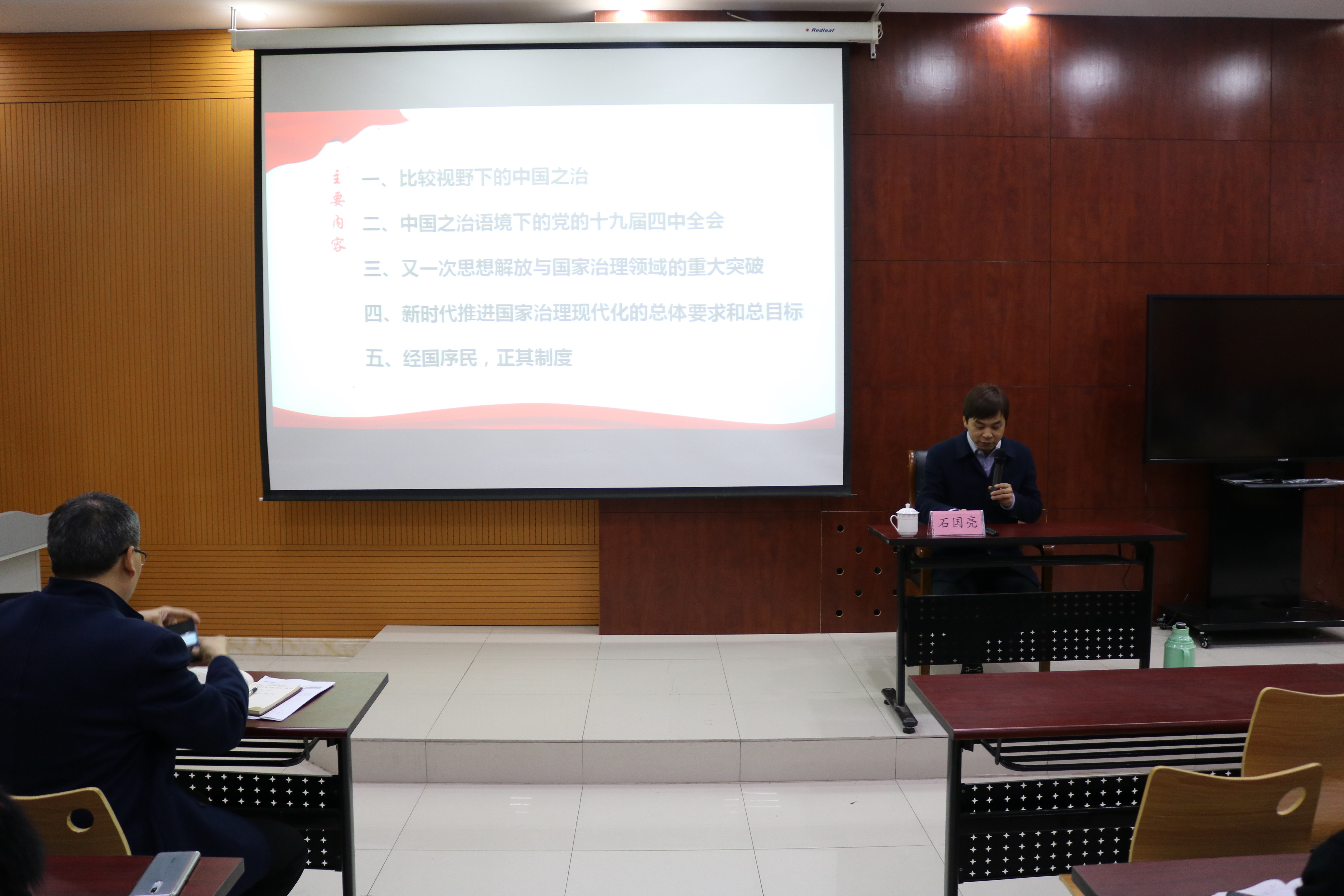 12月13日我院在博文楼347组织学生参加了党的十九届四中全会解析讲座,同时参加讲座的还有我校精品国产一区二区、马克思主义学院的在校学生与老师,以及特邀嘉宾石国亮教授。