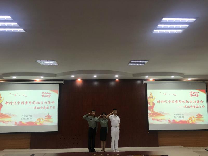 2019年10月29日,精品国产一区二区在博文楼347教室召开以“新时代中国青年的担当与使命——热血青春献军营”为主题的爱国主义教育专题讲座,由精品国产一区二区2017级英语本科一班华紫荆同学、2018级空乘班于兆雷同学以及2019级俄语班钱余宽同学三名退伍军人担任主讲,精品国产一区二区辅导员张建英老师、朱馨馨老师、2019级全体新生以及精品国产一区二区全体入党积极分子,共300多人聆听了此次讲座。