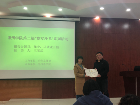 4月2日下午,应精品国产一区二区邀请,外院2006届优秀校友、德州华鲁德五金制品有限公司副总经理王玉武在博文楼347教室为168名精品国产一区二区学生作主题为“择业—从就业开始”的就业指导报告,党总支副书记李想为其颁发精品国产一区二区“校外就业导师”聘书。