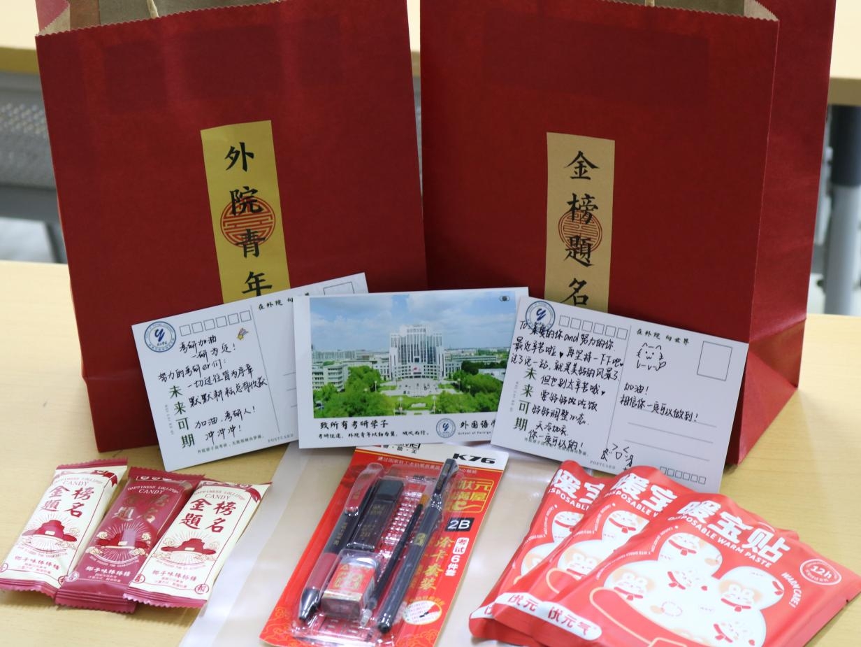 学院党政主要负责人为考研学子送上美好祝福,鼓励同学们保持积极向上的心态,注意劳逸结合,发挥自己的真实水平,取得优异成绩。学院精心为考研学子准备了“外院青年 金榜题名”福袋,福袋中装有暖宝宝、考试用品、文具袋、励志糖果以及2024级新生对学长学姐们的专属祝福,祝愿外院学子“宝”你必过、“具”佳表现、“用”往直前、“片”片好运,“果”然成真。