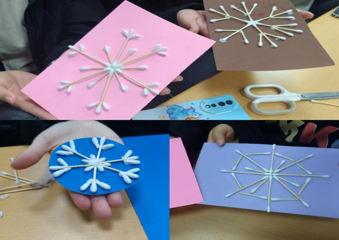 活动开始时由主持人介绍活动的目的、流程及注意事项,提醒同学们安全使用剪刀、白胶等工具。并且向同学们播放了相关制作教学视频,向同学们传授了一些制作技巧方法。正式开始后,同学们都快速行动起来,或选择团队合作,或独立构思,充分发挥自身想象力和创造力,将卡纸、棉棒进行巧妙地结合,创造出各式各样的“雪花”造型。最后,对同学们的作品进行了展示,共同欣赏独一无二的“雪花”,感受着创作带来的快乐和成就感。