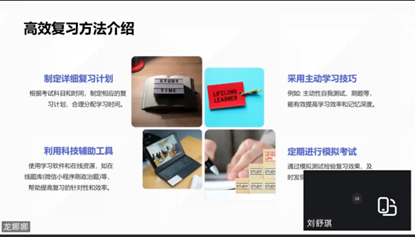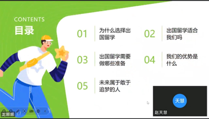 最后,魏婷娜老师结合自身经历和一系列案例强调了考研对提升个人学历、就业竞争力的重要性,赵天慧老师重点介绍了出国留学的相关事宜,包括留学优势、院校专业选择、材料准备、申请流程等,鼓励同学们积极申报,为提升个人专业素养、拓展职业方向、增强就业竞争力、促进个人成长而努力。