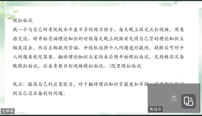 随后,在2024年考研复试中表现出色、成功被心仪院校录取的优秀学生赵珣、焦冠华和刘舒琪作为分享嘉宾,结合自身的复试经历,从不同角度分享了宝贵的经验和心得。赵珣详细介绍了考取中北大学英语语言文学硕士研究生的复试流程,包括笔试、面试两个环节,详细介绍了自我介绍、面试问题及第二外语面试需要做的相关准备,建议同学们早动手准备各个复试环节的内容,避免复试时出现过度紧张或放松情况的发生。焦冠华同学着重分享了天津师范大学英语笔译的复试面试过程及自己所做的各项准备,包括如何准备英语听力和英汉互译的笔试,如何准备和练习自我介绍、视译和专业问题,如何进行模拟面试,她还强调了考研成绩公布前准备工作的重要性及面试时妆容、着装等不同方面的注意事项。刘舒琪同学分享了哈尔滨师范大学学科教学(英语)的复试准备经验及面试经历,建议同学们提前通过报考学校官网了解复试形式,特别是熟悉面试的各个环节,除自己整理相关专业课笔记和材料外,还应积极与其他考研同学组建面试小组,开展模拟面试,相互指导自我介绍、试讲及相关专业知识提问等。