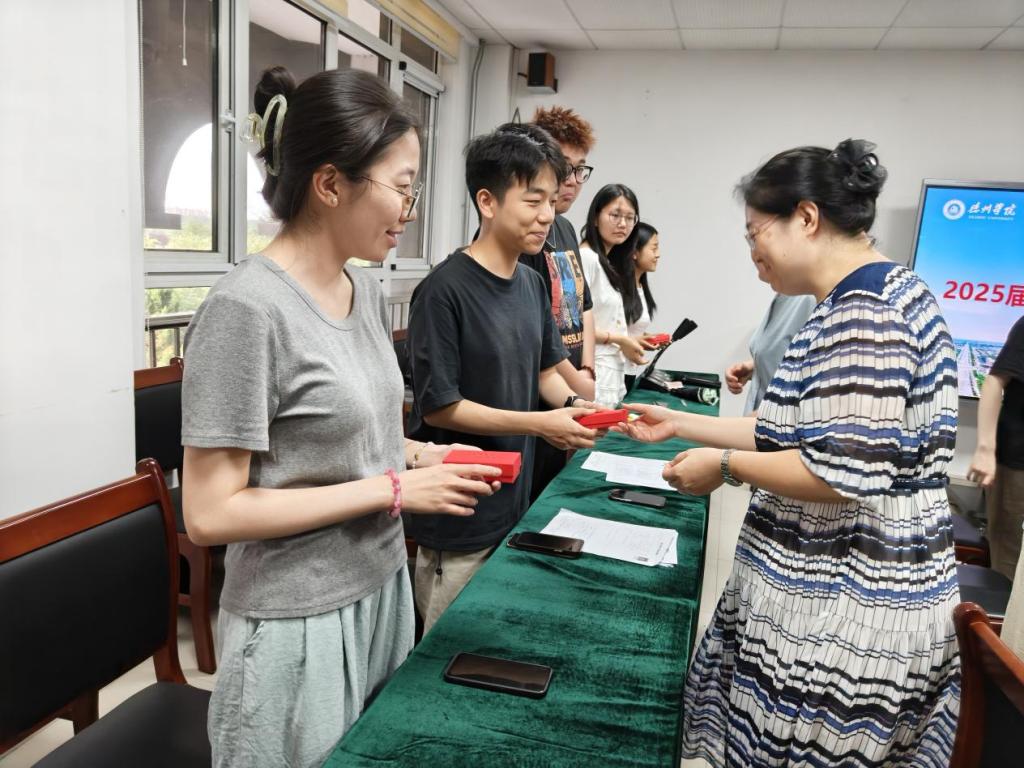 随后,毕业生纷纷发言,分享了自己在校期间的成长经历和感悟,表达了对母校的深厚感情和对老师们的感激之情。毕业生代表向学院赠予“桃李满天下”书法卷轴,以此表达对学院多年栽培之恩的感激之情。字里行间都凝聚着毕业生对学院最真挚的感谢和最美好的祝愿。最后,学院为毕业生准备了精美的纪念品——一枚刻有院训、院徽的方寸印章,方寸印章承载着对毕业生深切祝福与殷切期望,寓意他们在新征程中开启新篇章,用责任和信用书写出属于自己的精彩人生。