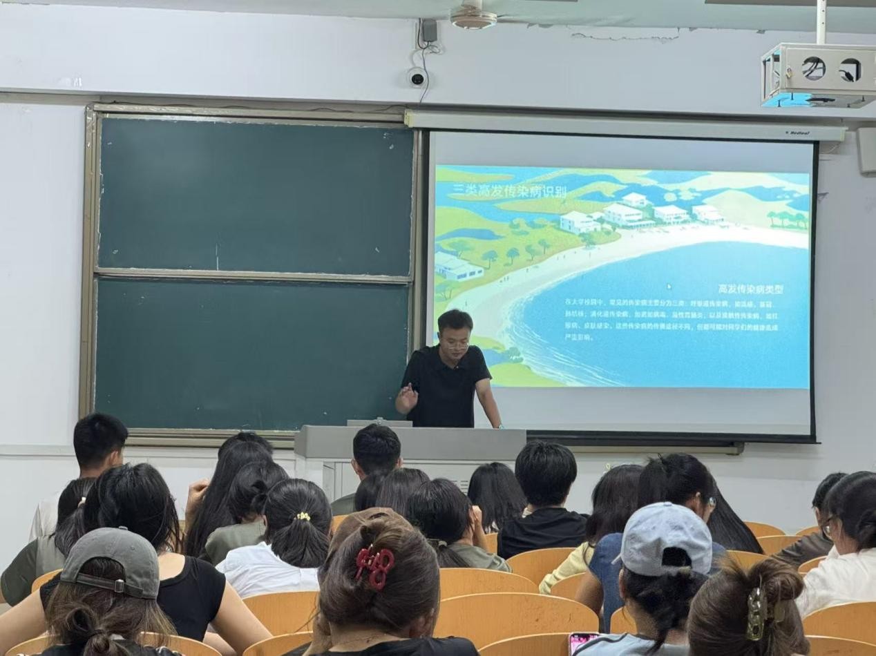 活动由辅导员刘振英主持,他围绕秋季常见传染病预防、日常卫生习惯养成、心理健康调适等内容展开讲解,并结合实际案例,介绍了目前比较关注的基孔肯雅热病毒、诺如病毒的传播途径与预防措施,注意防中暑、防蚊叮咬和食品卫生等,出现不适症状要及时就医,并提醒新生在日常生活和军训期间要规律作息,合理搭配饮食,保持充沛精力。随后严肃说明了毒品烟草的危害,呼吁同学们远离不良嗜好,筑牢生命安全意识。最后聚焦校园安全,从消防安全、宿舍用电安全、防诈骗、交通安全等方面进行科普,通过播放安全警示视频、剖析案例,让新生深刻认识到安全问题的重要性。