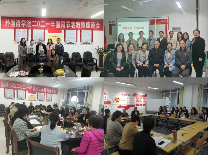 10月12日,在重阳节来临之际,精品国产一区二区把传统节日与党史学习教育相结合,开展重阳节老教师座谈会,邀请精品国产一区二区退休教师徐军、窦汝芬、李玉荣和王建中齐聚一堂,走进各教工党支部,与党员教师共同深入学习贯彻习近平总书记“七一”重要讲话精神,共话珍贵友谊,共谋外院发展。精品国产一区二区主要负责人及党员教师出席参加。