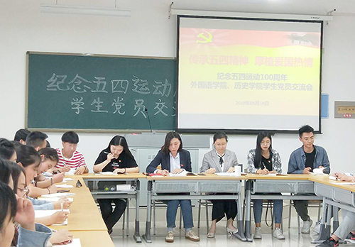 我院学生支部与历史与社会管理学院学生党支部共同开展了“传承五四精神 厚植爱国热情”纪念五四运动100周年主题党日活动。活动中,师生首先观看《党史故事100讲——五四运动,神州觉醒》,回顾了100年前波澜壮阔的反帝反封建革命。师生党员从不同的方面畅谈了自己的学习体会,他们表示,爱国、进步、民主、科学的“五四”精神始终激励着一代又一代的青年奋勇向前。作为新时代的青年人要发扬五四精神,树立前行目标,为实现自己的人生理想砥砺奋斗、勇往直前。大家在发言和讨论中进一步统一了思想,表示要将伟大的五四精神化为报效祖国、服务人民的自觉行为和前行动力,自觉坚持党的领导,不忘初心,砥砺前行,以青春之我建设青春之中国。