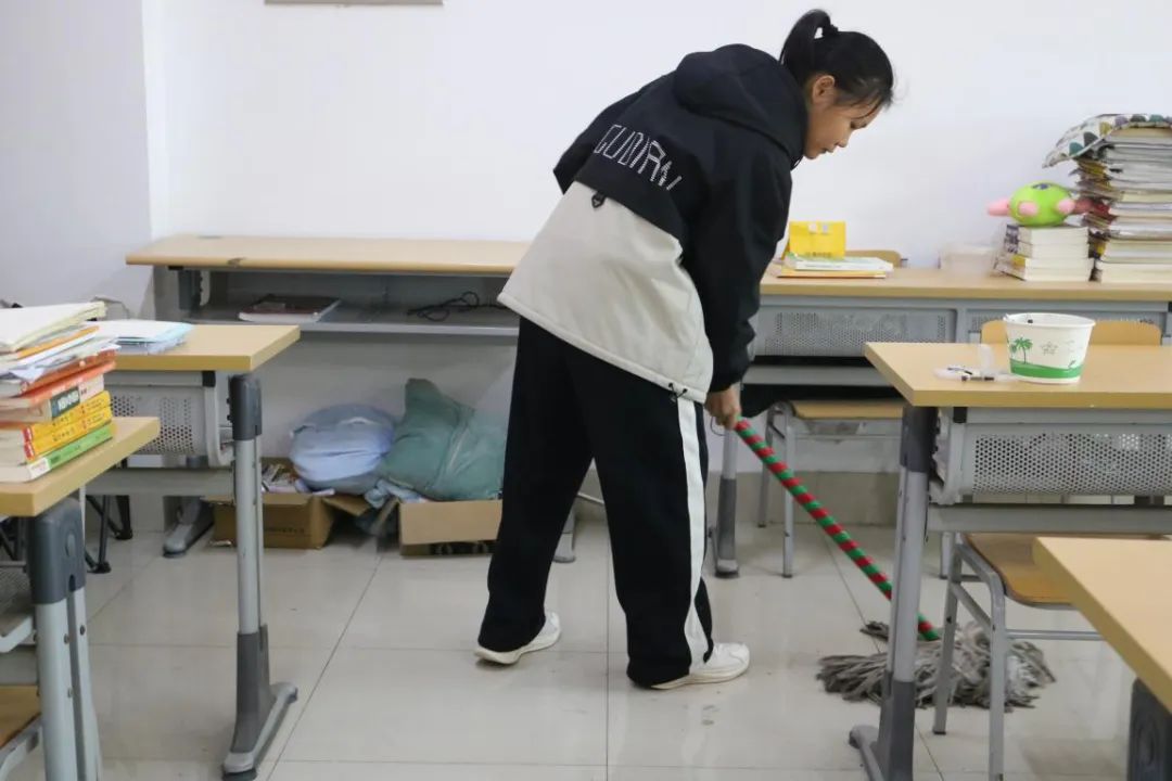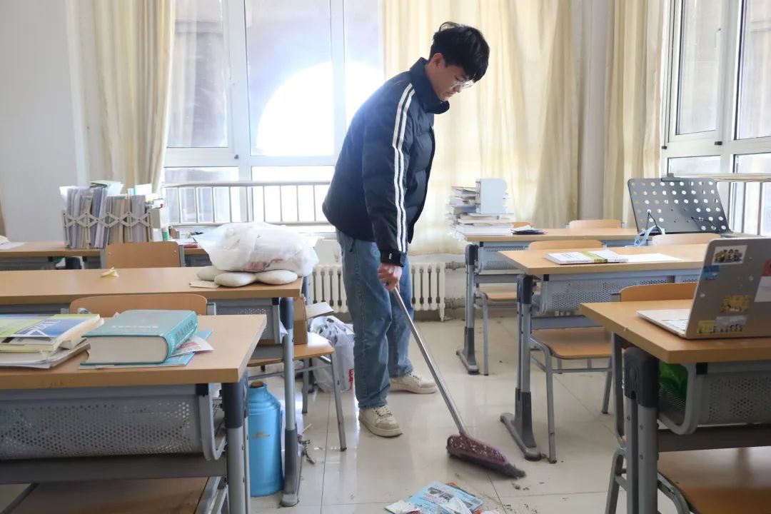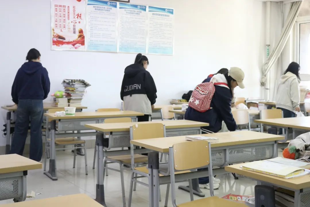 活动当天,志愿者们分工明确,携带清洁工具提前到达教室,迅速投入到清洁工作中。他们对地面、桌椅、黑板等区域进行了彻底清扫,同时重点清理了角落、窗台缝隙等卫生死角,确保教室焕然一新。此外,志愿者们还从考研学子的实际需求出发,整理摆放考研资料和书籍,优化教室空间布局,为备考提供宽敞、舒适的学习环境。